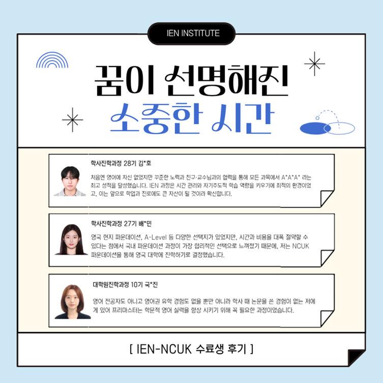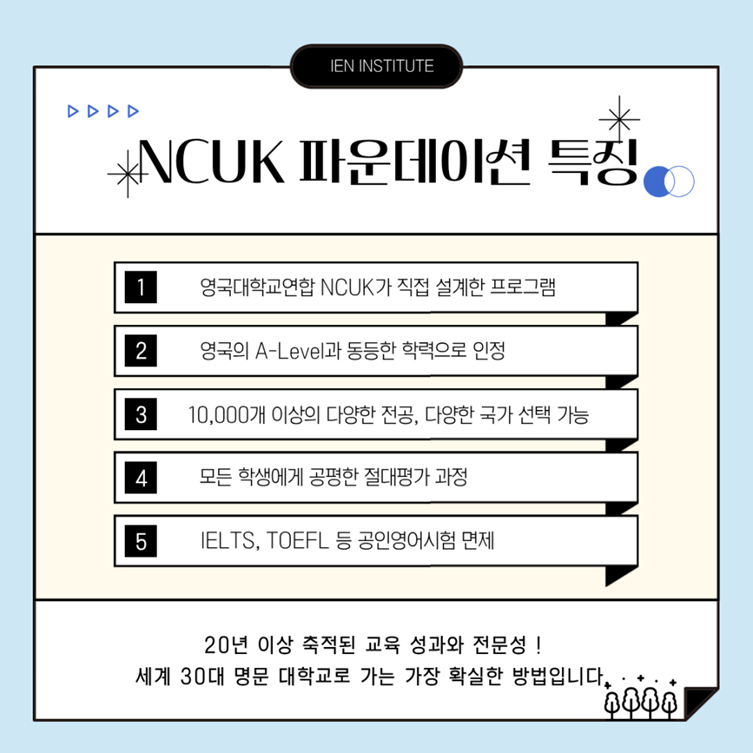 영국 국립 대학교들이 만들고 입학 보장하는 프로그램인 NCUK 파운데이션 과정을 통해, 한국에서도 세계 명문대 진학을 준비할 수 있기 때문입니다.